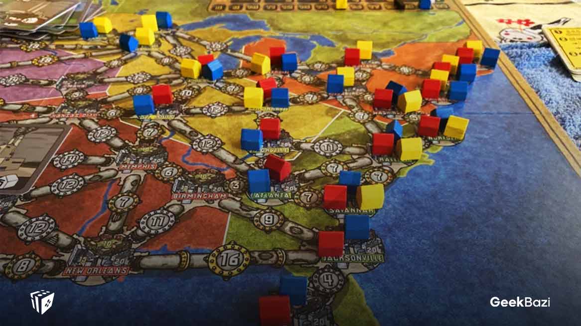 این بازی با یک تخته دوطرفه همراه است که در یکطرف آن نقشه ایالاتمتحده و در طرف دیگر نقشه آلمان وجود دارد. هر نقشه دارای شش منطقه است که شامل شهرهایی با هزینههای مختلف بین آنها است. تعداد مناطق استفادهشده بر اساس تعداد بازیکنان است. نقشه یک جزء استراتژیک کلیدی در بازی است، زیرا برخی از مناطق بهطورکلی هزینههای اتصال بالاتری نسبت به سایرین دارند.